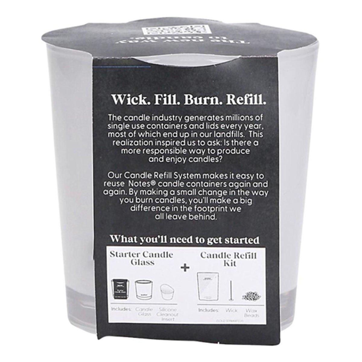{"reviews":[],"offset":0,"limit":10,"total":0}"Full Description:\nA perfect place to get started, this NOTES® Starter Candle is the only candle you will ever need. Millions of single use containers end up in landfills every year, so by making a small change in the way you burn candles, you'll make a big difference in the footprint we all leave behind.\n\nFeatures:\n\u003cul>\n\u003cli>Includes a reusable glass vessel and removable silicone liner.\u003c/li>\n\u003c/ul>\n\nSpecifications:\n\u003cul>\n\u003cli>For use with the Notes Refill Kit (Sold seperately)\u003c/li>\n\u003c/ul>\n"