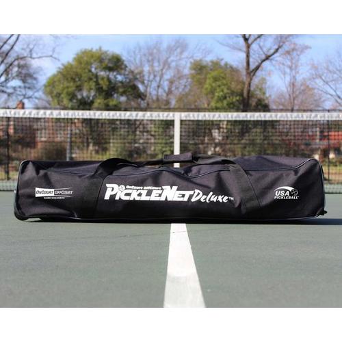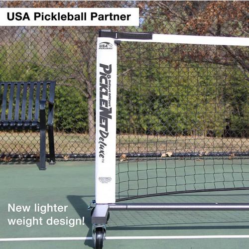 Note that the PickleNet Deluxe is a heavier-duty version of our popular PickleNet. The PickleNet Deluxe is more stable, featuring 1.5" x 3" oval tubing and locking 4" wheels, for easier use and transport.