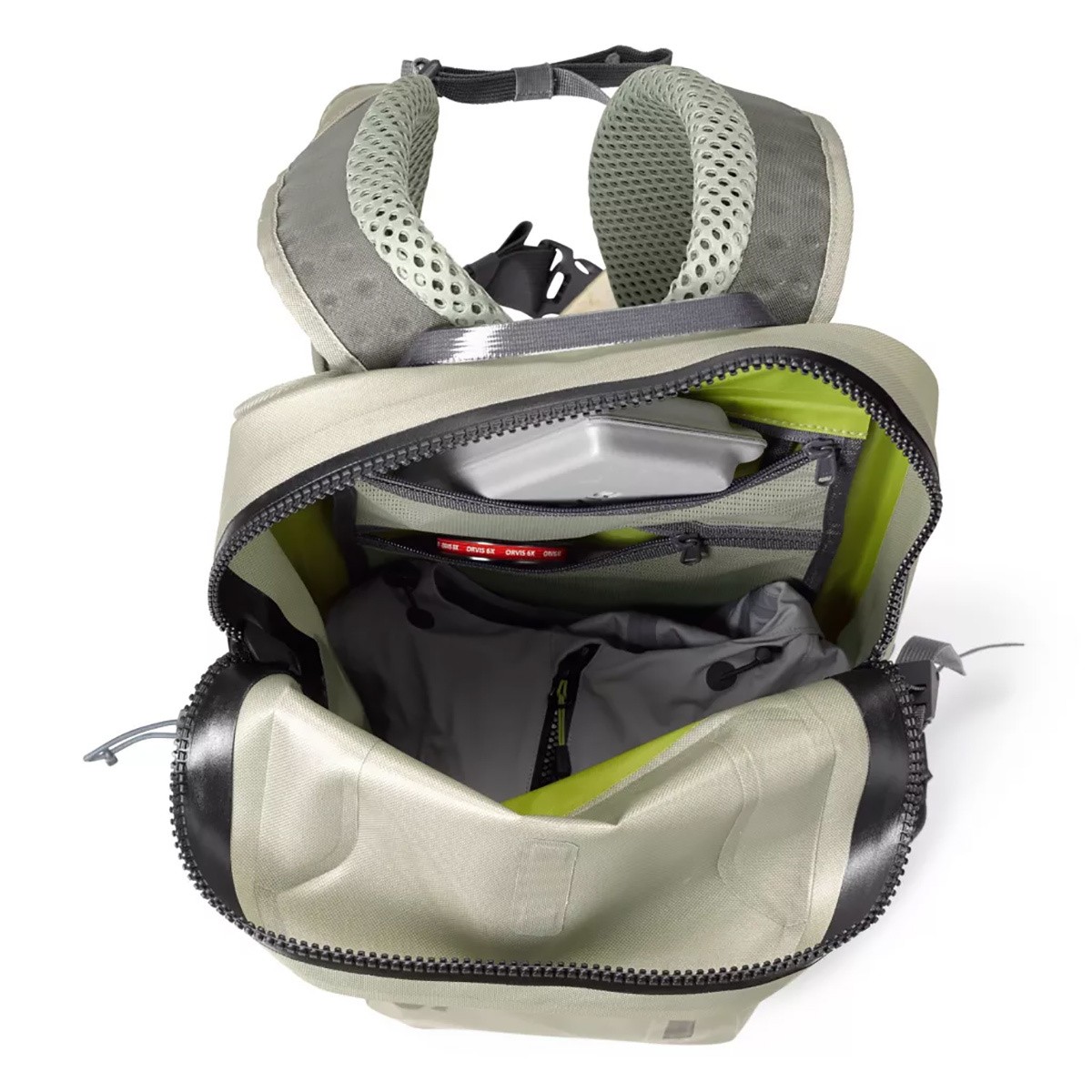 Our durable PRO Waterproof Backpack 30L, is constructed from 840-denier, abrasion- and puncture-resistant ballistic nylon, and then coated with .1mm TPU on both sides of the fabric. We’ve yet to see a more waterproof and thoroughly seam-sealed pack collection on the planet. Thirty waterproof liters of storage give you ample day pack capability and then some. With a slightly longer back panel, we’ve even rethought the way a pack capable of holding so much gear sits on your hips, yet wears like it’s hardly even behind you. Our answer came in the form of a wider lumbar strap/buckle with larger, pocketed wings. Both fit and feel just right without constricting movement. Also note the beefy, submersible, easy-slide, #10 TIZIP® MasterSeal zipper, as that one’s critical. With actual teeth that grab and seal, it prevents the dreaded blowout that plagues packs with a sandwich bag-style closure. Gear stays bone dry and access is easy thanks to a generous opening with an interior we’ve brightened up by adding a high-vis chartreuse color. We’ve also redesigned the shoulder straps and back panel with perforated 10mm foam padding, decreasing weight and bulk while allowing for better air circulation. In short, the days of the dreaded ‘misty back’ are over. Deep dive into further features and you’ll find an integrated back panel net scabbard and exterior D-ring, rod-tube cam straps, water bottle pocket with retention leash, and internal hanging pockets to keep gear organized.