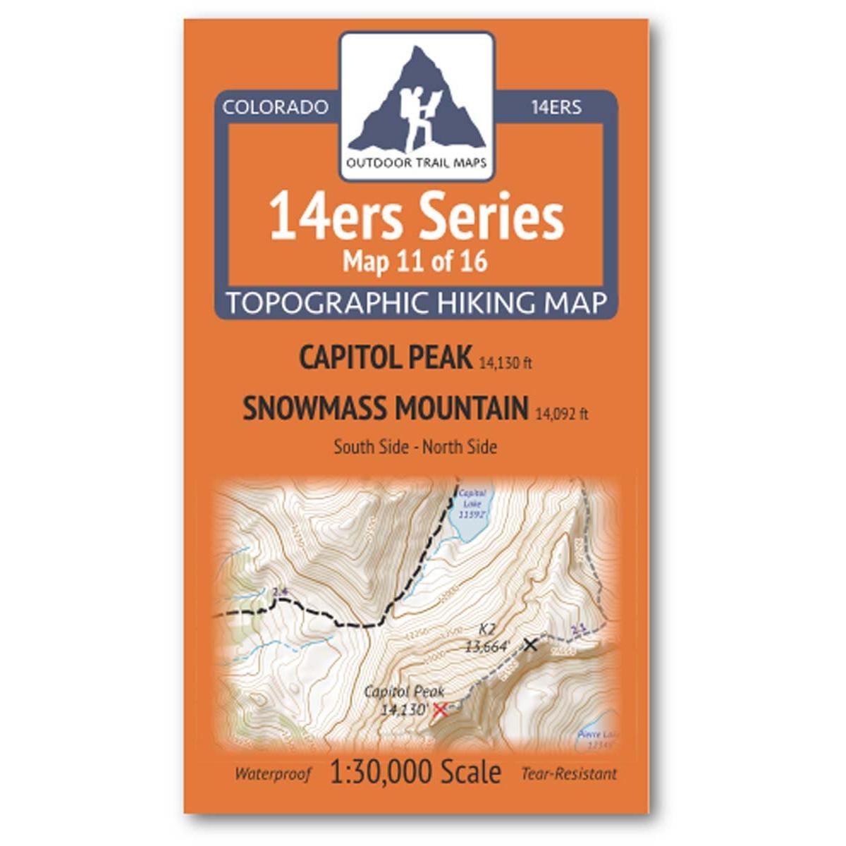 14ers Series Topographic Hiking Map 11 of 16 covers fourteeners Capitol Peak and Snowmass Mountain (south side) on the front and Capitol Peak (north side) on the back, including all hiking trails in the surrounding areas. This rugged trail map was designed for on-trail use in the toughest outdoor conditions and includes the following features: