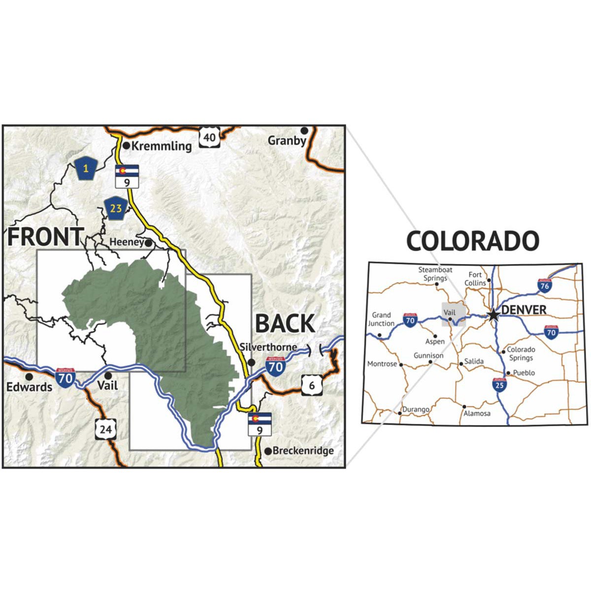 The front of the map shows the western area of the Gore Range and Eagles Nest Wilderness, covering hiking trails in the areas north of Vail, Red Sandstone Road, Piney Lake, Elliot Ridge and Cataract Lake. The Back of the map shows the eastern and southern portions of the Gore Range, covering all of the hiking trails west of Silverthorne and Frisco.