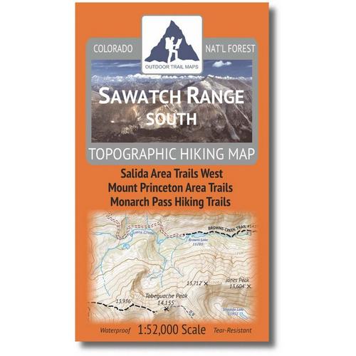 The Sawatch Range South Topographic Hiking Map shows all of the hiking trails in the southern portion of the Sawatch Range of central Colorado south of the Collegiate Peaks Wilderness to Monarch Pass, with these features: