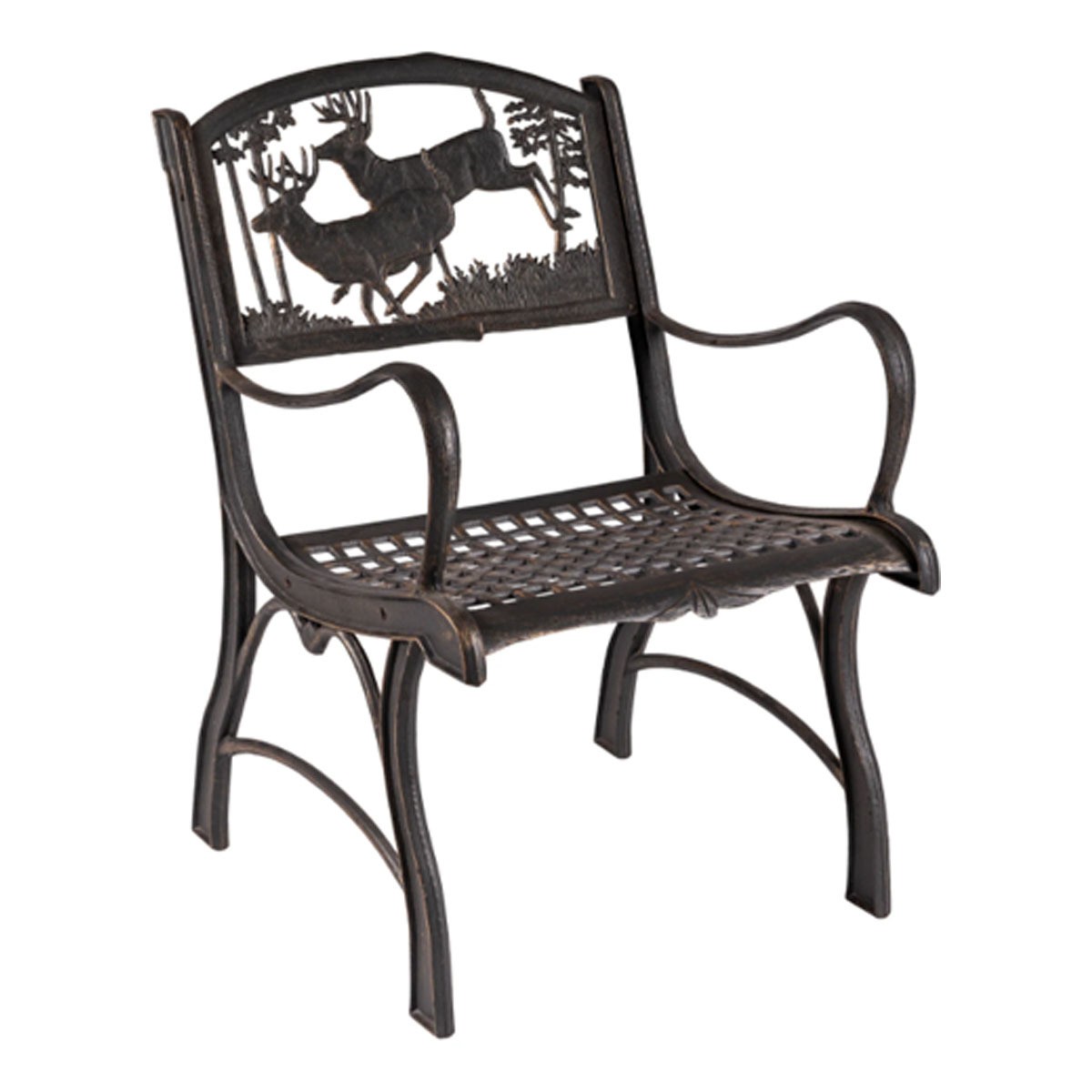 The Bucks Chair features two running whitetail deer in a woods setting. The baked on bronze powder-coat finish and hand-painted gold highlights make the chairs both attractive and maintenance free.