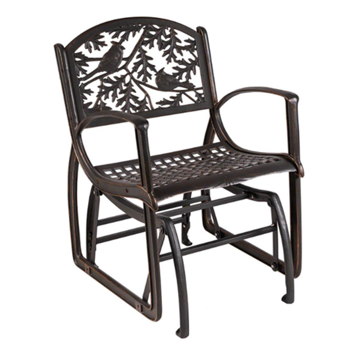 The Cardinal Glider Chair features two of America's favorite songbirds among oak leaves. The baked on bronze powder-coat finish and hand-painted gold highlights make the chairs both attractive and maintenance free. A cast iron base is standard, providing a smooth, quiet glide and lots of stability.