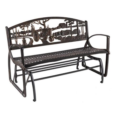 The Farmstead Glider Bench provides an additional seating option for decks, patios, and front porches. The glider is ergonomically-designed to have a comfortable feel, while the glider is smooth and quiet, making this the perfect seat to enjoy a sunset for two in the country! The cast iron design features a bronze powder coat finish and hand painted gold highlights. Weather-resistant.