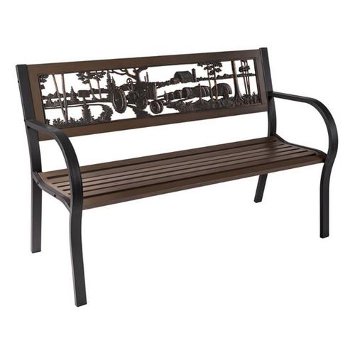 Our Tube Steel benches provide a lighter weight bench option, featuring an umber-toned seat and back frame and slate gray side rails, with an artist-designed cast iron back. The two-tone tube steel Farmstead Bench features a classic American farm scene. Artist-designed, this bench makes a perfect gift!