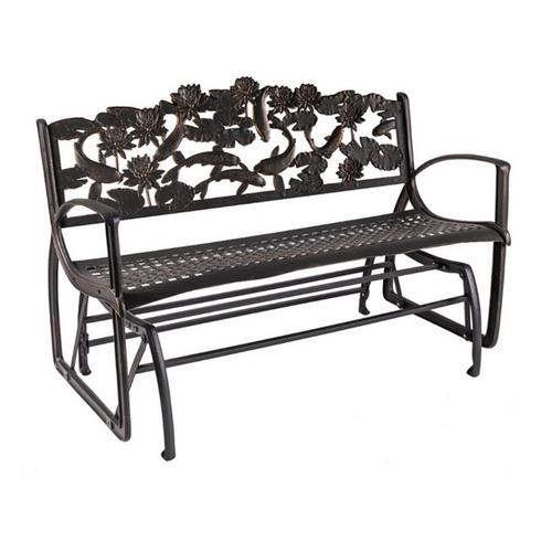 The Koi Glider Bench features the same artist-designed cast iron back as the Cast Iron Koi Bench. Featuring a school of koi amidst water lilies, the glider bench includes a bronze powder-coat finish and hand painted gold highlights. Painted Sky glider benches and chairs are smooth, quiet, and very comfortable.