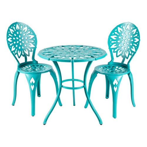 Our Modern Sunflower Bistro Set offers a bright table for two for your favorite outdoor space! Constructed of high quality cast iron, you do not have to worry about this set blowing away outdoors. Available in turquoise blue, chili pepper red, or parakeet green, the bistro sets feature weather-resistant paint. Each set includes a table and two chairs. Rubber feet included to protect flooring and decking.