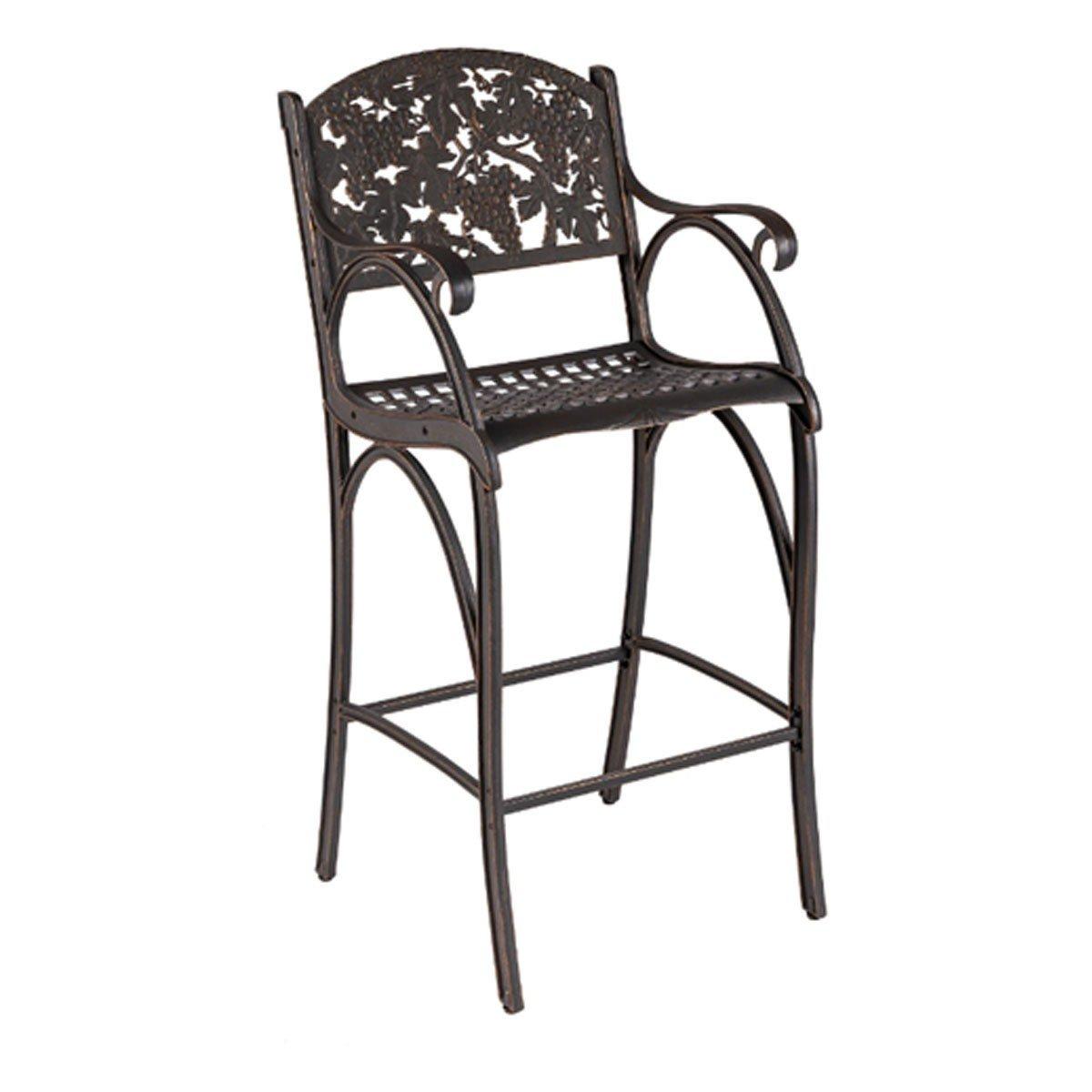 Relax among the vines with vineyard themes pub set, featuring a tall pub table and two matching chairs. The Grapes Pub Chair design includes artist-designed grape foliage. The pub chairs are made of premium cast aluminum, featuring a bronze powder coat with hand painted gold highlights. Can be purchased with matching Grapes Pub Table. Chairs and tables sold separately.