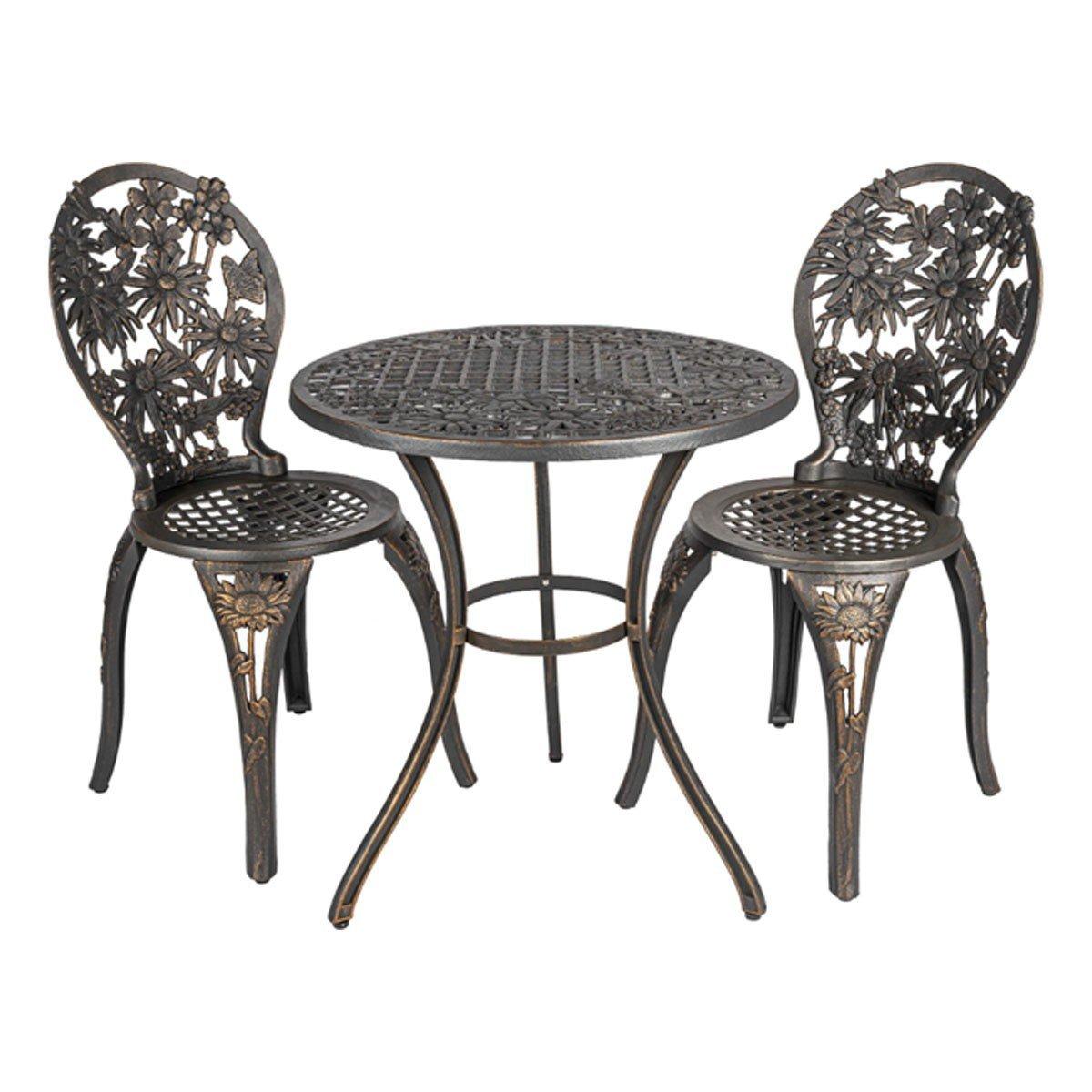 While the Wildflower design, including hummingbirds and butterflies, is a work of art, the bistro set is completely functional for everyday use. Constructed from high-quality cast iron, it is durable, weather-resistant and maintenance-free. The set includes a table and two chairs. Includes bronze powder coat finish with hand painted gold highlights.