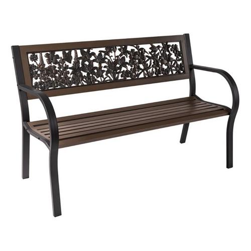 Our cheerful two-tone tube steel Wildflower Bench provides a lighter weight bench option, with an artist-designed cast iron seat back. The seat and back frame are umber, and the side rails are slate gray. The Wildflower Bench features a hummingbird and butterfly hidden amidst popular wildflowers.