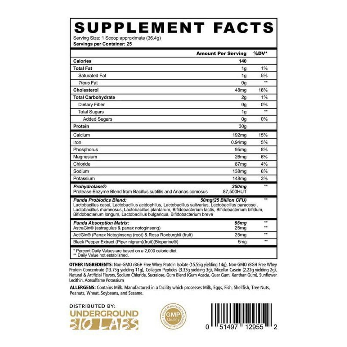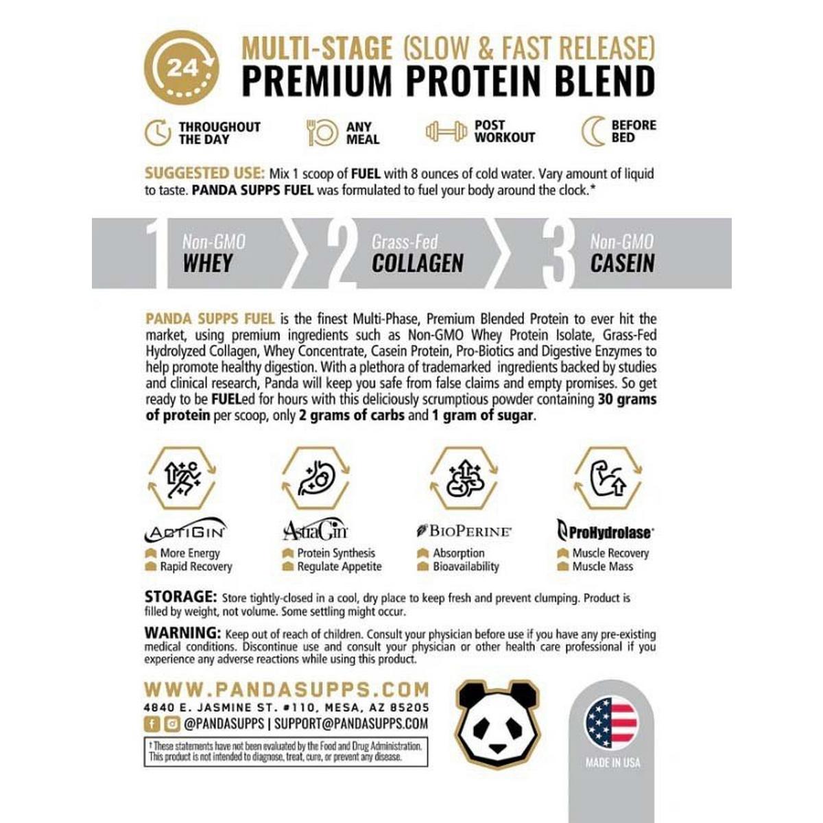 PANDA SUPPS FUEL is the finest Multi-Phase, Premium Blended Protein to ever hit the market, using premium ingredients such as Non-GMO Whey Protein Isolate, Grass-Fed Hydrolyzed Collagen, Whey Concentrate, Casein Protein, Egg Protein, Pro-Biotics and Digestive Enzymes to help promote healthy digestion. With a plethora of trademarked ingredients backed by studies and clinical research, Panda will keep you safe from false claims and empty promises. So get ready to be FUELed for hours with this deliciously scrumptious powder containing 30 grams of protein per scoop, only 2 grams of carbs and 1 gram of sugar.