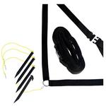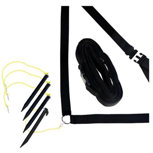 This 2 inch black volleyball boundary is perfect for sand or grass play and is adjustable to FIVB standards. It includes four 10" ABS corner stakes with bungee cord attachments, and durable plastic buckles that allow for proper adjustment to court boundary; is easy to use and designed for long-lasting use.