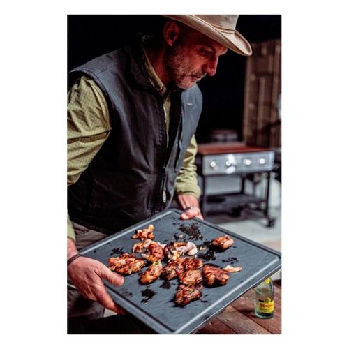 The Heat Shield is a Richlite Cutting Board which is heat resistant up to 350 degrees and will stand up to whatever you throw at it. All Pecos cutting boards fit to our tables and won’t slide off the surface.