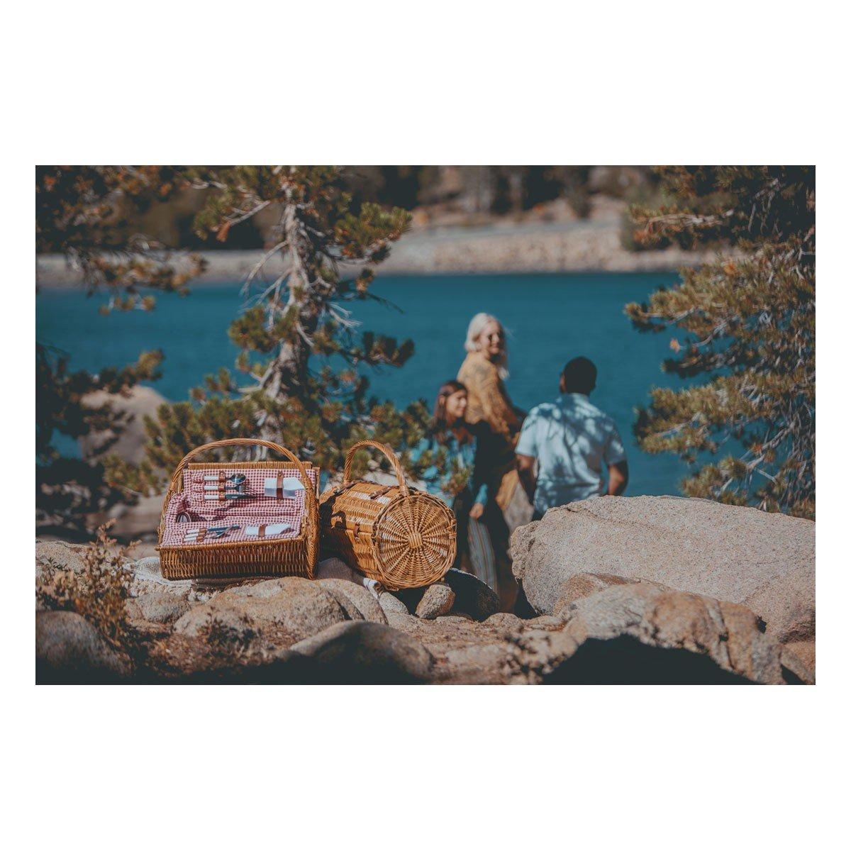 It may be hip to be square, but this design has us over a barrel! The future of romantic couples picnic time lies in the rounded willow contours of the Barrel Wicker Picnic Basket for 2. Give the gift of a deluxe vintage English-style picnic set featuring wine and cheese service for two. This large handwoven willow-constructed wicker two-lid picnic basket comes equipped with two porcelain plates, stainless steel silverware, two hand-blown wine glasses, a salt & pepper shaker set, and a stainless steel waiter-style corkscrew. All items secure easily to the fully-lined interior of the picnic basket with sturdy leather straps. This willow wicker basket also comes loaded with a durable lining and 100% cotton napkins and tablecloth. If you’re looking for a unique and thoughtful wedding or anniversary gifts for a favorite couple or your own special husband or wife, look no further.
