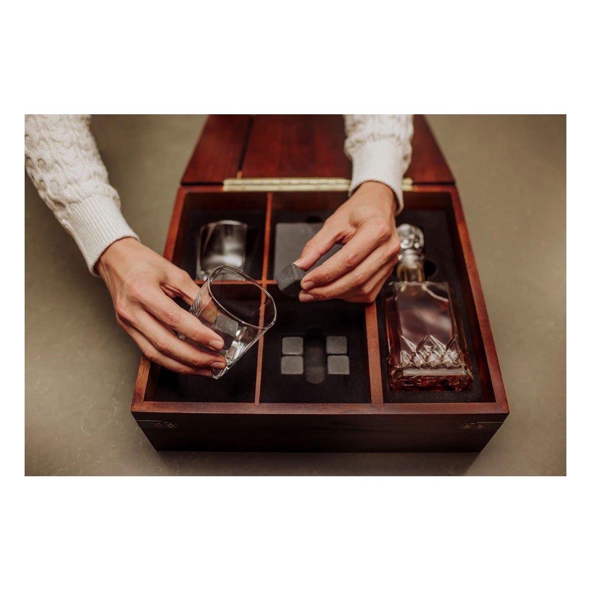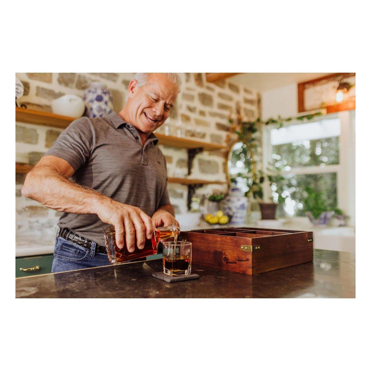 Every tradition and heirloom had to start somewhere. Start your own with the Whiskey Box with Decanter Gift Set, a dark and handsome parawood chest with rustic nails containing 2 lowball glasses, 6 whiskey stones, 2 coasters, and a 750mL glass decanter.