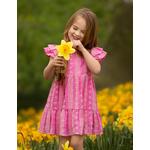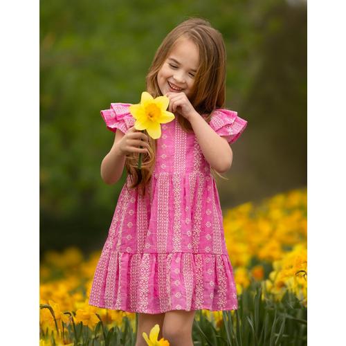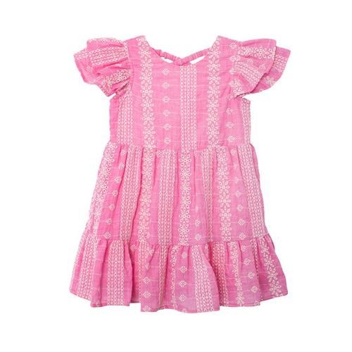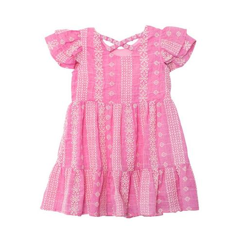 This vibrant pink dress features delicate white embroidery. Designed with flutter sleeves, a tiered skirt, and a criss-cross back detail, it offers a playful yet elegant look. The lightweight fabric ensures comfort, while the gathered waist and ruffled hem add volume and movement, making it perfect for warm-weather outings.