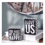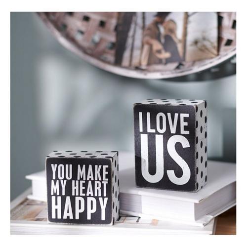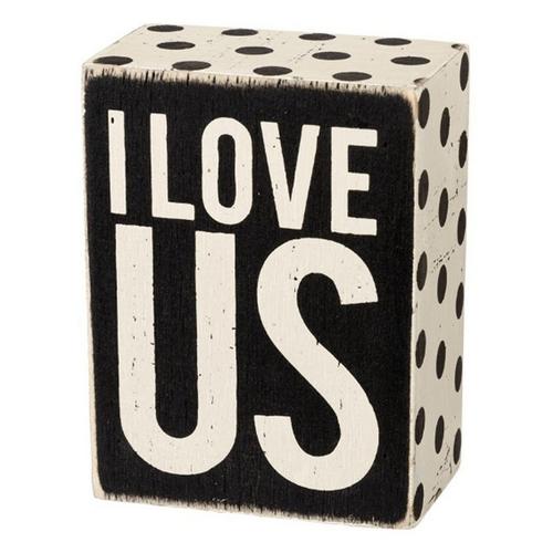 A classic black and white wooden box sign from our Box Sign Collection features a distressed "I Love Us" sentiment with polka dot trim designs. The I Love Us is easy to hang or can free-stand alone.
