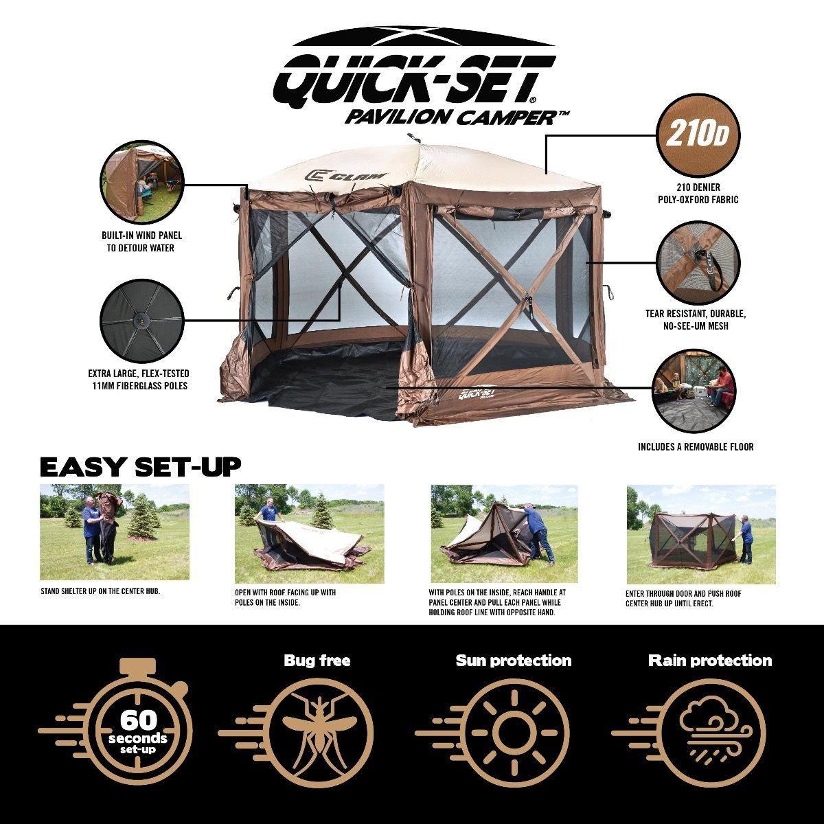 The Quick-Set Pavilion Camper has crossed over into the tent camping space with an included removeable floor! This durable vinyl floor can be installed or removed easily with quick position toggles in each corner and velcro spanning the perimeter of the shelter, making the Pavilion Camper the perfect shelter for your overnight excursions in the outdoors. This shelter also includes all of the great features found on the Pavilion including the zip down privacy wind panels and the larger screen tent perfect for a group of people!