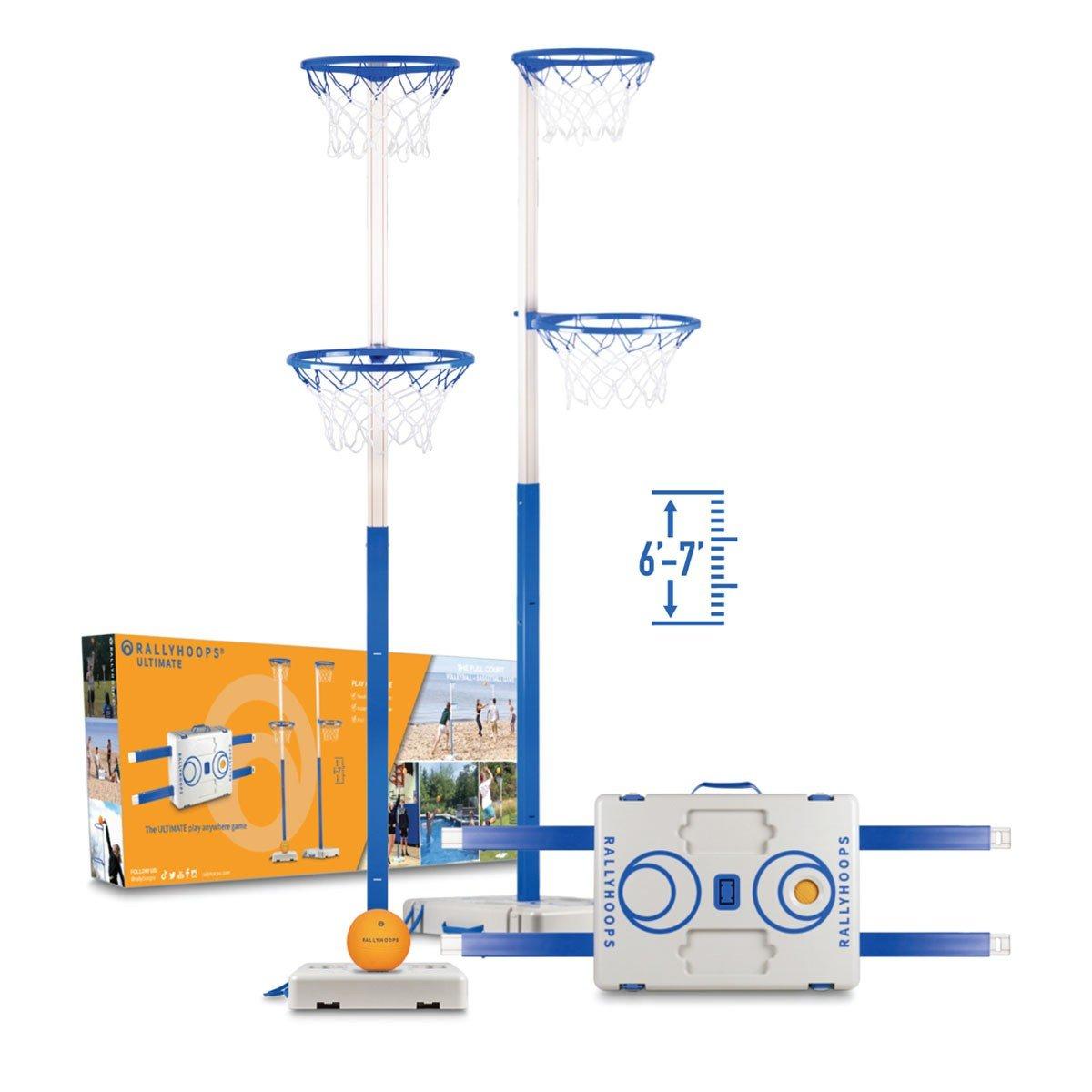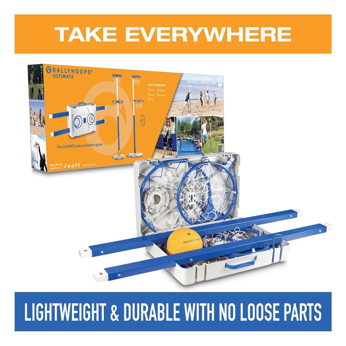 RallyHoops Ultimate allows you to play our volleyball + basketball game anywhere, including the pool! The telescopic tubes are height adjustable making it the ULTIMATE play anywhere game. The Full-Court game packs into a lightweight, portable briefcase that can be set up within seconds. Take it anywhere, play it everywhere!
