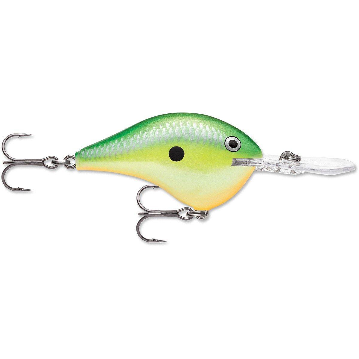 The Rapala DT Dives To Crankbait will dive fast to a preset depth and stay in that strike zone longer than other crankbaits. Made from balsa wood and featuring strategically places internal weights, the Rapala DT creates the ultimate crankbait action, while the ultra-thin polycarbonate lip helps dig the bait down quickly to the correct depth. Ideal for long casting up to 150 feet the Rapala DT stays in the strike zone for longer periods of time. Additional features include VMC® black nickel hooks, premier finishes in a variety of color patterns, and an internal baritone rattle for reliable sound performance.
