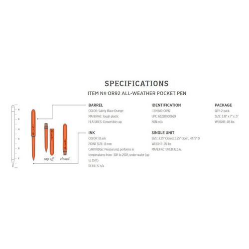 {"reviews":[],"offset":0,"limit":10,"total":0,"gtin":"632281100669"}"Full Description:\nStash anywhere. Write everywhere. If you need a handy all-weather pen, this value pack is for you.\n\nFeatures:\n\u003cul>\n\u003cli>Writes Upside Down: Pressurized ink cartridge performs in temperatures from -30F to 250F, under water (up to 35ft), and at any angle.\u003c/li>\n\u003cli>Ink won’t stop: Proprietary ink and delivery system used exclusively in Rite in the Rain pens will write without skipping in extremely wet conditions.\u003c/li>\n\u003cli>Convertible Cap: Cap snaps securely onto the end of pen creating a comfortable standard-size barrel.\u003c/li>\n\u003c/ul>\n\nSpecifications:\n\u003cul>\n\u003cli>Weight: .05lbs\u003c/li>\n\u003cli>Size: 3.18” x 7” x .5”\u003c/li>\n\u003cli>Convertible Cap\u003c/li>\n\u003c/ul>\n"