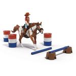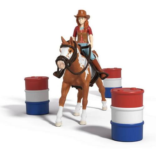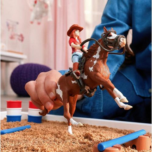 It’s finally here – Hannah’s western adventure can begin! She has decided to take part in barrel racing with her loyal Paint Horse Gelding. They have practiced hard for this tournament. The three barrels have already been set up on the paddock. The goal: To maneuver her horse round these barrels in a set sequence as quickly as possible. Are they fast enough to win? But before the tournament starts, Hannah warms up a little with her Paint Horse Gelding and has her jump a few obstacles. Of course, she wears a cowboy hat and sits in the western saddle. The two look great, don't they?