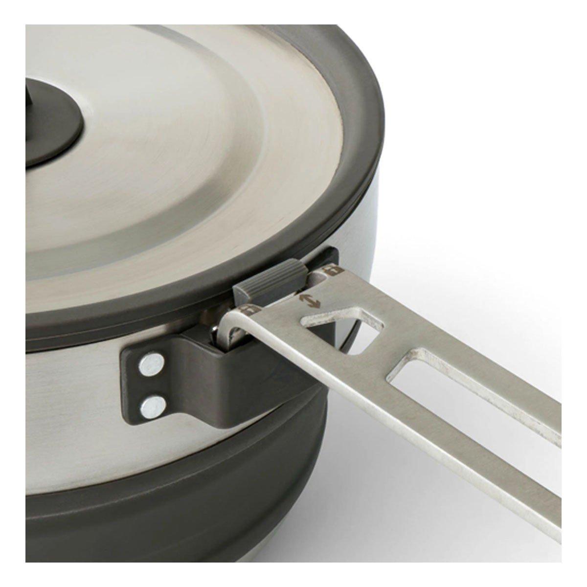 Induction-compatible, collapsible stainless steel pots with a three-layer base for even heat transfer form the heart of a great camp kitchen. Dual Click-Safe handles allow you to securely hold, carry and pour from the pots. The handles can be reversed to secure the lid (and any nesting tableware) during transport. A detour means sometimes taking the longer way on your journey; Detour cookware means you're the kind of person who doesn't cut corners.