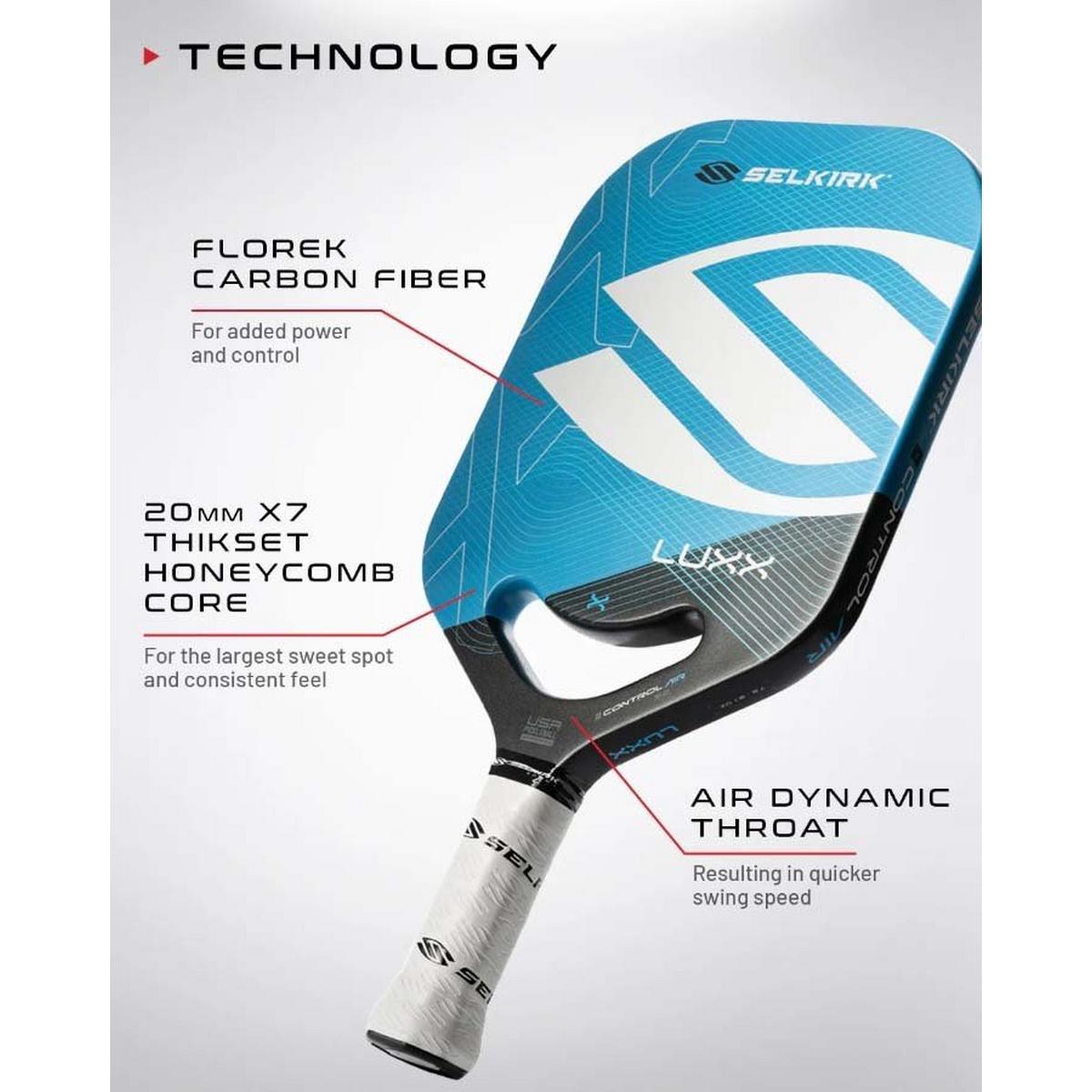 The Luxx Control Air introduces transformative Florek Carbon Fiber technology to expand the sweet spot, amplify power play, and enable optimal performance on the court. Paired with a new X7 Thikset Honeycomb core, proprietary 360° Proto Molding construction, and enhanced Aero-DuraEdge Edgeless technology the paddles achieves unequaled control, accelerated spin, and ample power.
