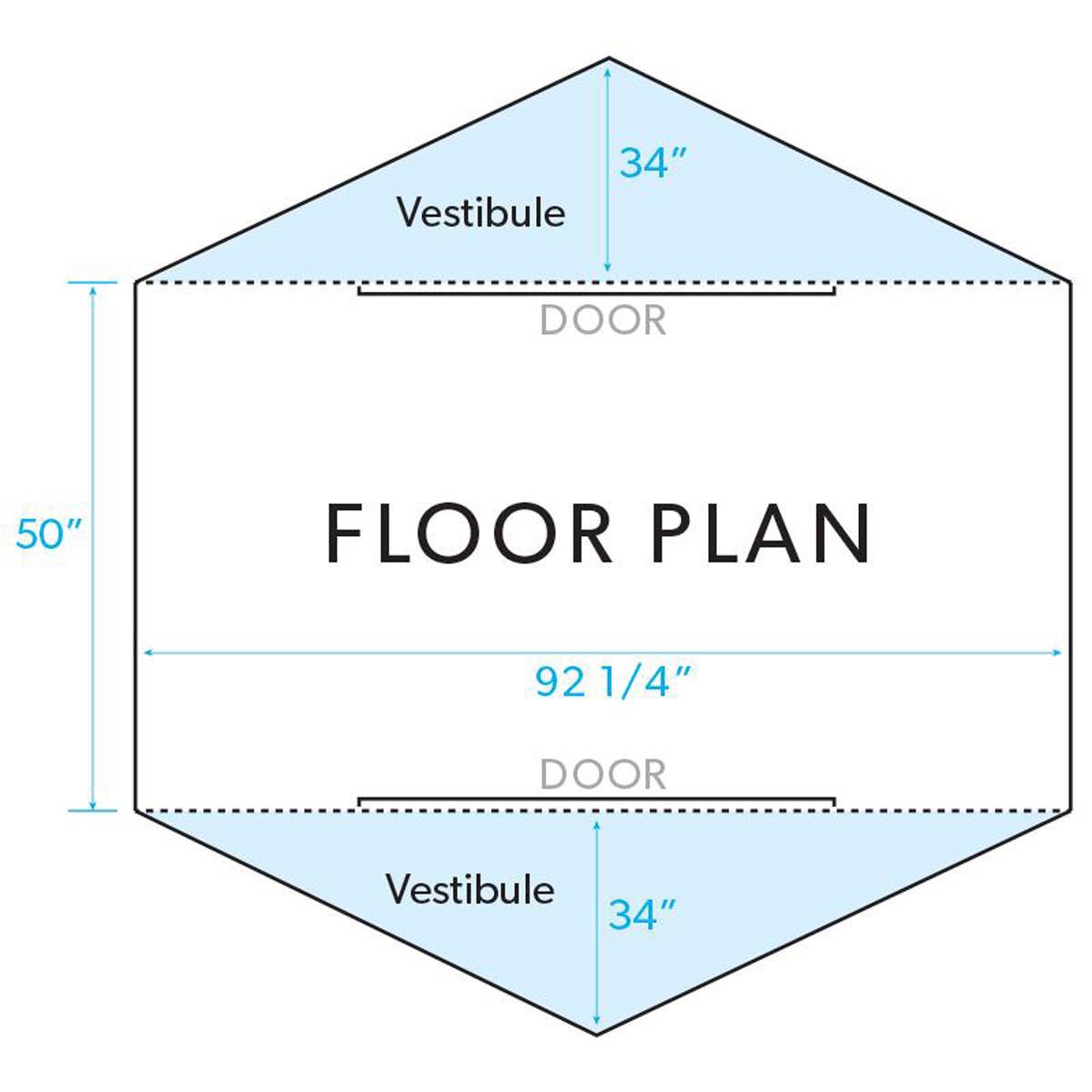Vents: 2 mesh window vents on doors, 1 through-vent in end wall with mesh and ripstop layers, 2 flysheet kickstand vents
