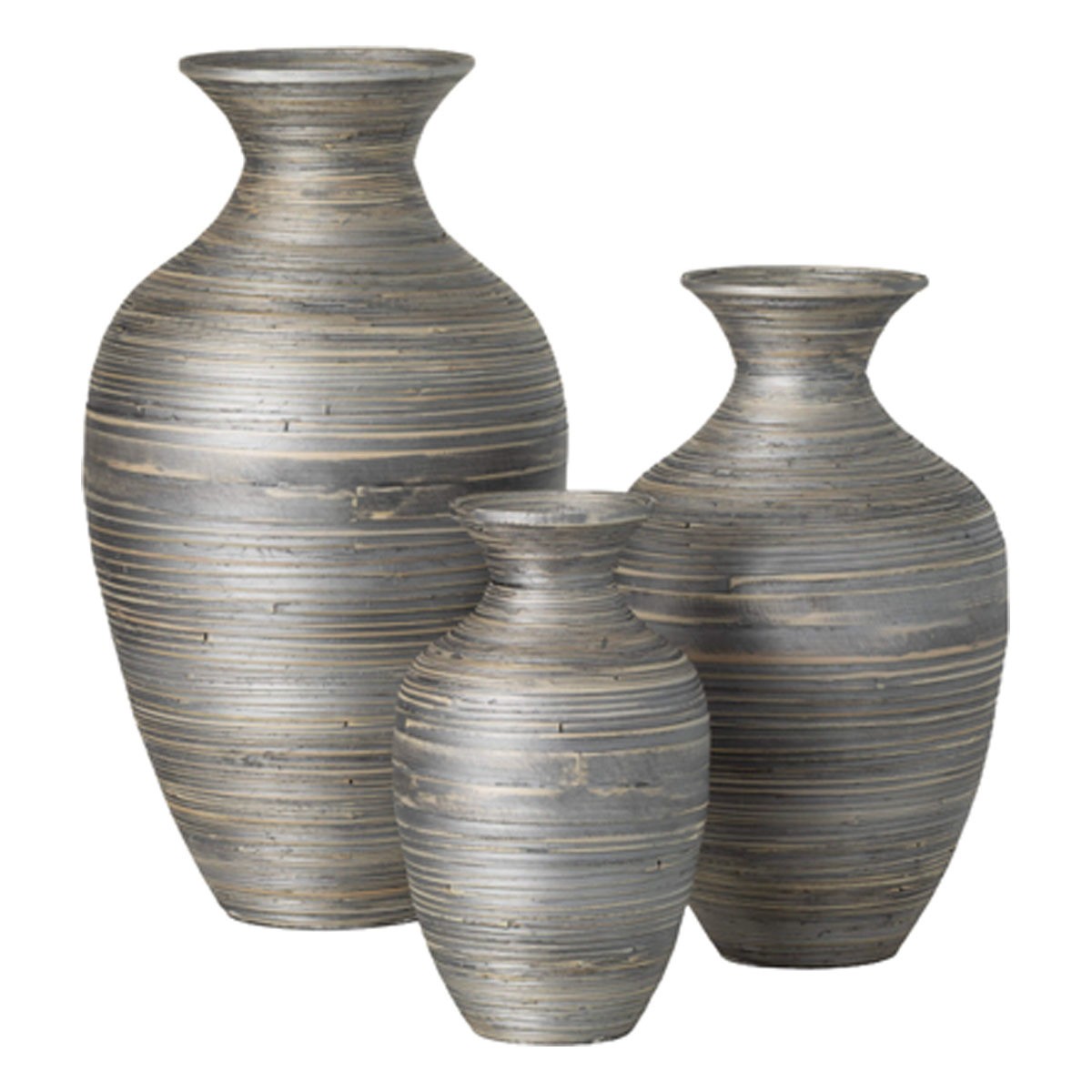 This set of three unique vases feature modern shapes and masculine hues. Curated in warm gray with a distinctive pattern, these vases are beautiful filled with faux florals or left as-is for an elegant statement. Lighter than imagined due to the bamboo material.