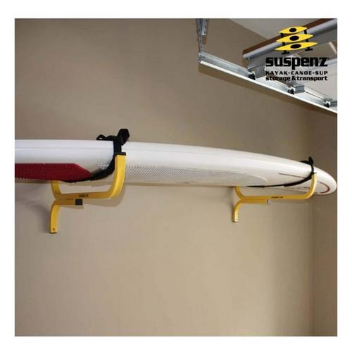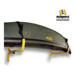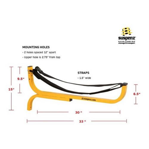 Maximize your storage space with these heavy-duty racks, designed to mount like shelves and securely hold your watercraft! Perfect for canoes, kayaks, paddleboards, and even cargo boxes, the Suspenz FLAT Rack allows you to store your vessels right-side up or upside down. Constructed from durable powder-coated steel with rectangular tubing, these racks mount flush to your wall and extend 33” for easy access. The suspension strap system cradles your watercraft on straps that conform to its shape, therefore, eliminating pressure points and protecting against hull distortion. Safety straps ensure your watercraft stays securely in place. With a load capacity of 125 lbs, it accommodates watercraft up to 34” wide (or 36” with a 2x4 mounted between the rack and wall). Perfect for both indoor and outdoor use, this rack is built to handle all your storage needs.