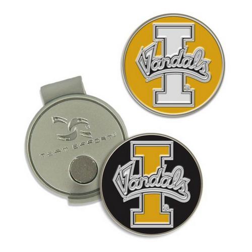 Magnetic hat clip with ball markers attaches to hat or visor. It includes two interchangeable iron stamped ball markers embellished with team trademark.