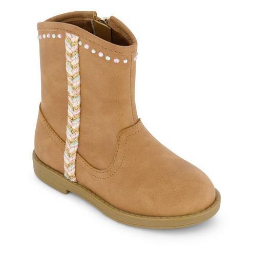 This Little Girls Western-Inspired boot has a gorgeous suede like finish with sweet braidied detailing with pastel and metallic colors for a stylish look for all casual occasions this season.