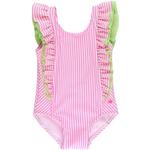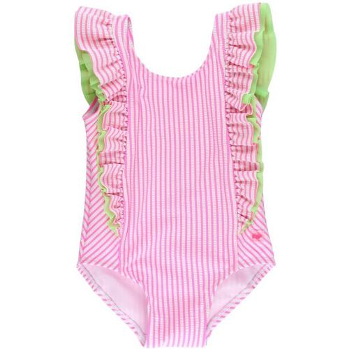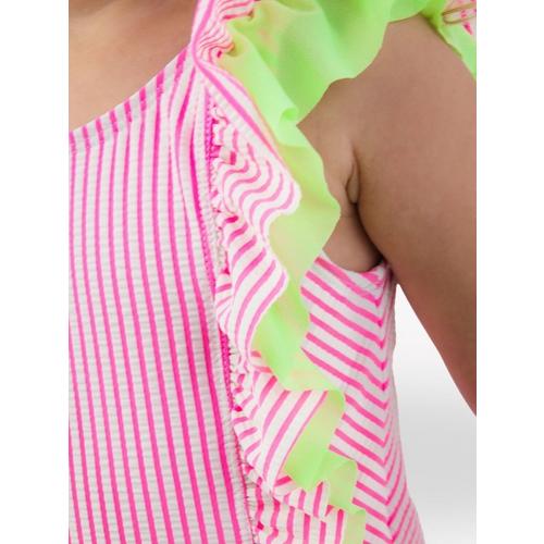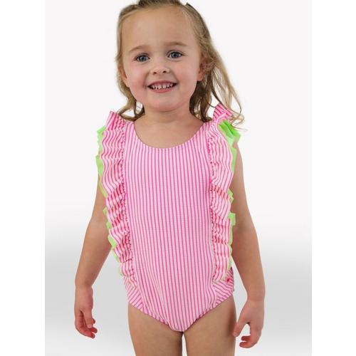 Neon Pink Seersucker Seersucker Waterfall One Piece Swimsuit: Dive into style with this vibrant neon pink swimsuit designed especially for girls. The ruffle detail cascades like a waterfall, adding a playful touch to this pink seersucker one-piece. It features a bow detail that enhances its charming look, perfect for any fun water activity. This swimsuit is not only stylish but also practical with full seat coverage ensuring comfort and modesty. Crafted with a 4-way stretch fabric, it offers great flexibility and fits snugly, allowing freedom of movement in and out of the water. Moreover, the fabric is designed to resist snagging and pilling, making it durable for endless summer adventures. It's also a fully lined girls swimsuit, providing extra protection and privacy. Importantly, this neon pink girls swimwear comes with UPF 50+ sun protection, safeguarding your little one from harmful UV rays. Ideal for those sunny days at the beach or pool, it combines style, comfort, and protection perfectly.