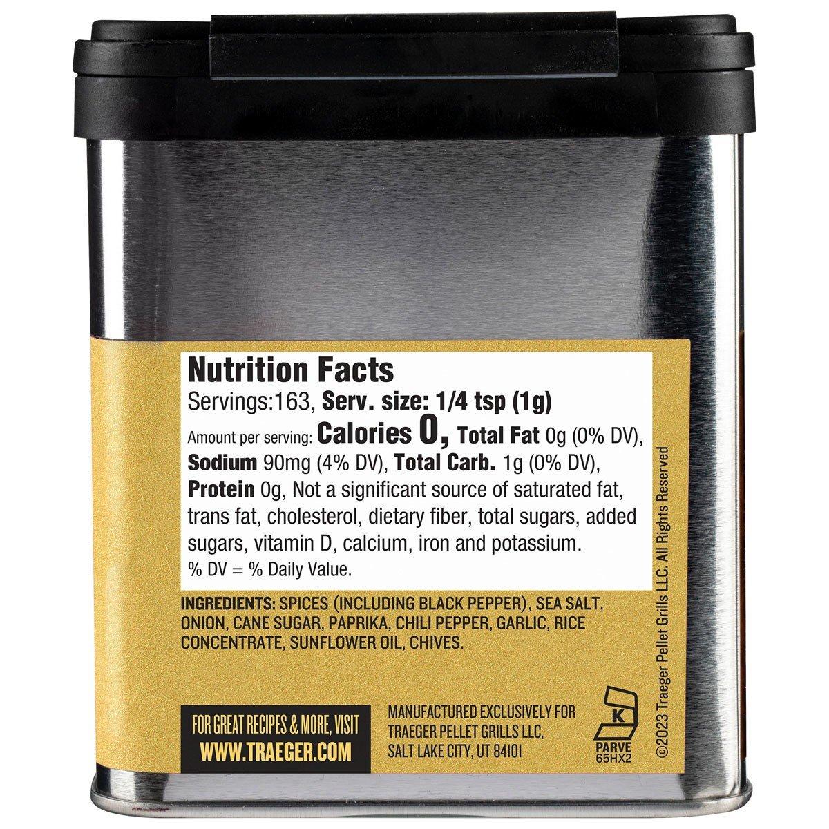 Ingredients: Spices (Including Black Pepper), Sea Salt, Onion, Cane Sugar, Paprika, Chili Pepper, Garlic, Rice Concentrate, Sunflower Oil, Chives.