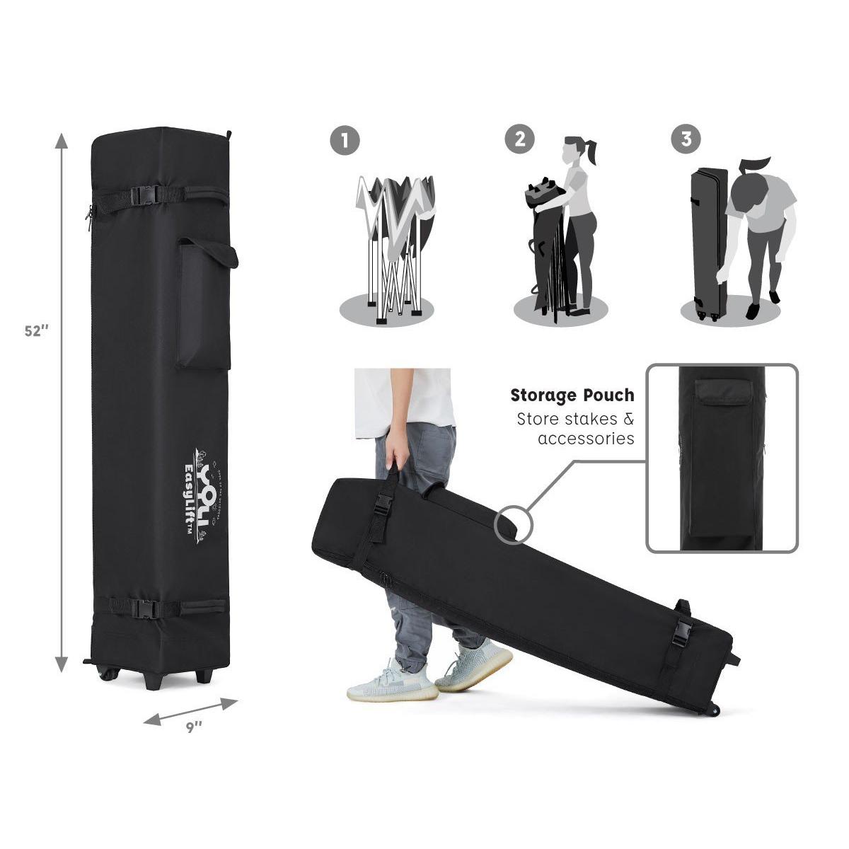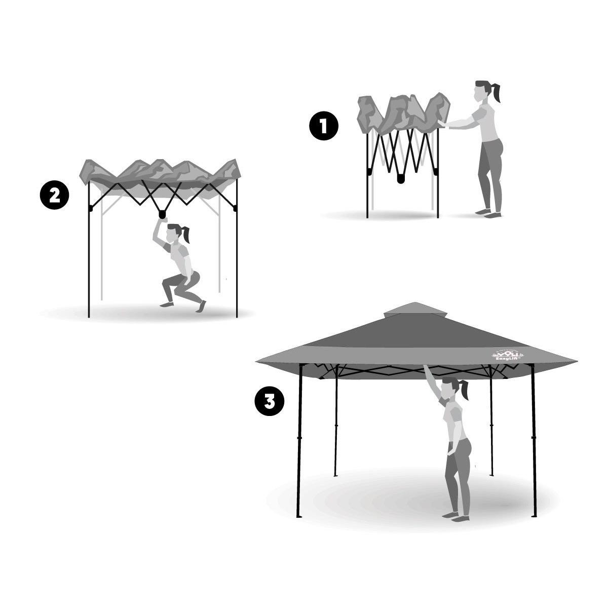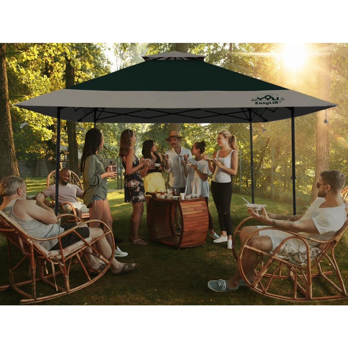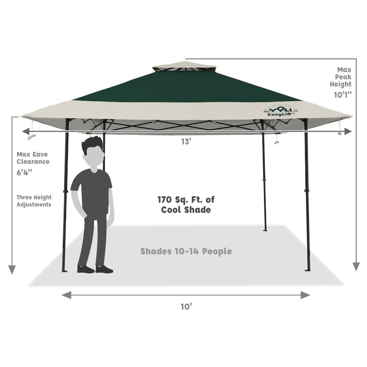 Open Up the Outdoors™ with YOLI’s Pagoda EasyLift 170 13’x13’ Instant Canopy. EasyLift™ Technology makes it fast and easy to set up with 1 person or 2. Open up the fully assembled steel frame, push up on the center hub and extend the legs for an impressive 170 sq. ft. of shade! Extended eaves design provides an additional 70 sq. ft. of shade on a 10’x10’ frame to protect and cool 10 to 14 people.