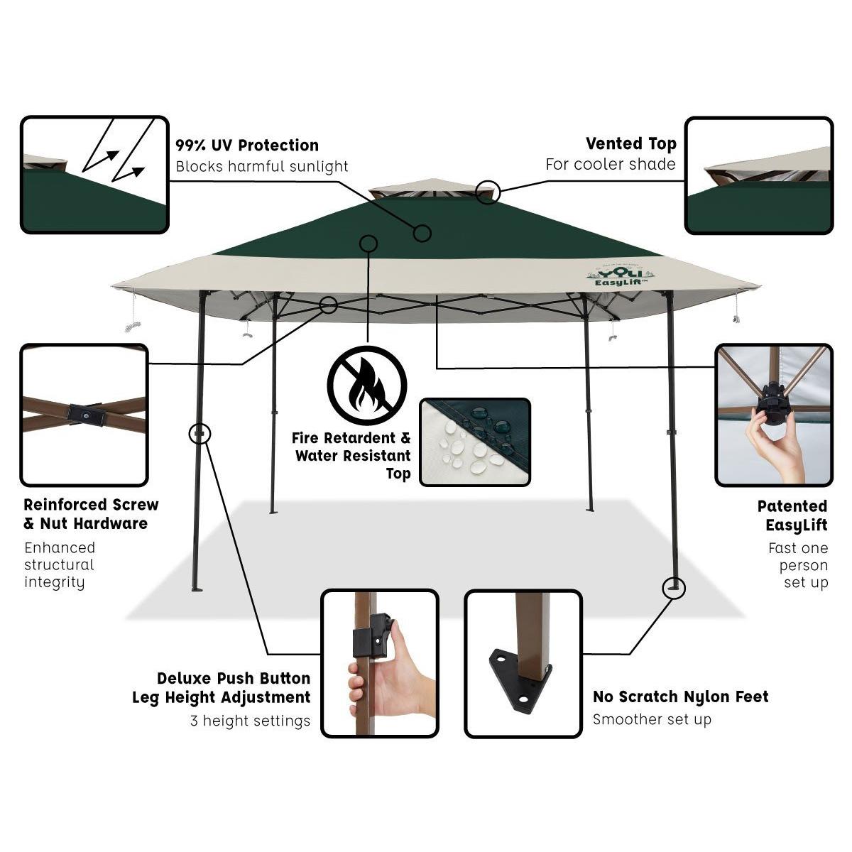 Premium two-tone sand and deep green canopy top with walnut powder coated finish creates a backyard retreat or an oasis of shade at any destination. Canopy legs adjusts to 3 different heights at the push of a button. 150D polyester top is water resistant and fire retardant (CPAI-84 certified) with a 4-sided vent at the peak for enhanced air flow.