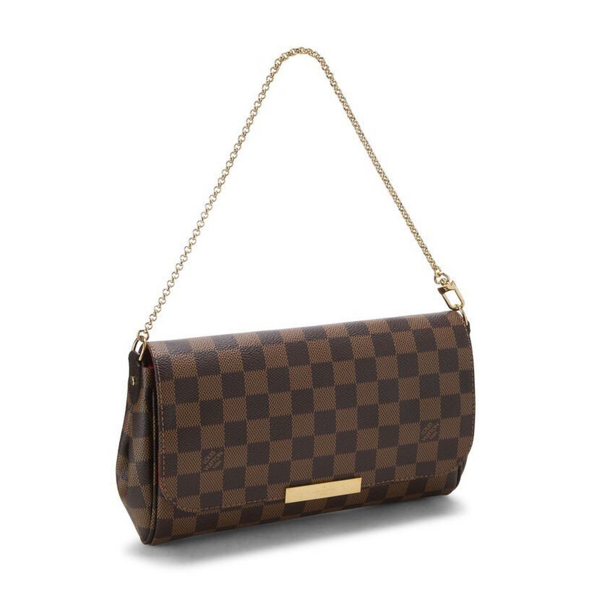 A slim and compact shoulder bag, this authentic pre-owned Louis Vuitton Favorite bag is rendered in the iconic Damier Ebene checkered canvas and accented with a leather shoulder strap. The bag features dual removable straps for versatile wear and can be carried as a clutch or shoulder bag.