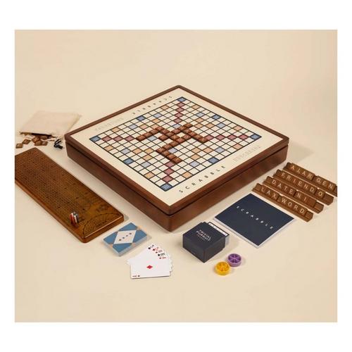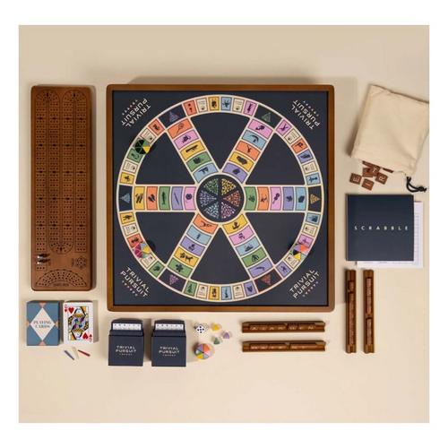 Three classic games, one well-crafted cabinet. This all-in-one set includes Scrabble, Trivial Pursuit, and Cribbage, with a reversible game board and storage neatly tucked under the lid. Whether you’re landing a triple word score, testing your trivia knowledge, or building hands and counting points, everything you need is easy to access and ready to play.