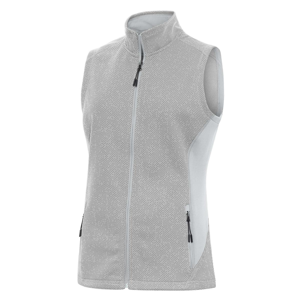 100% Polyester heather honeycomb pattern full zip vest with solid jersey face fleece back insets. On seam zipper hand pockets and dyed to match coverstitch detail. Open bottom hem.