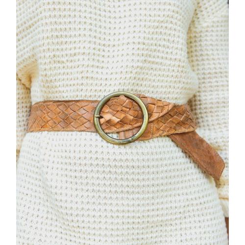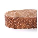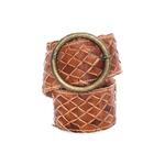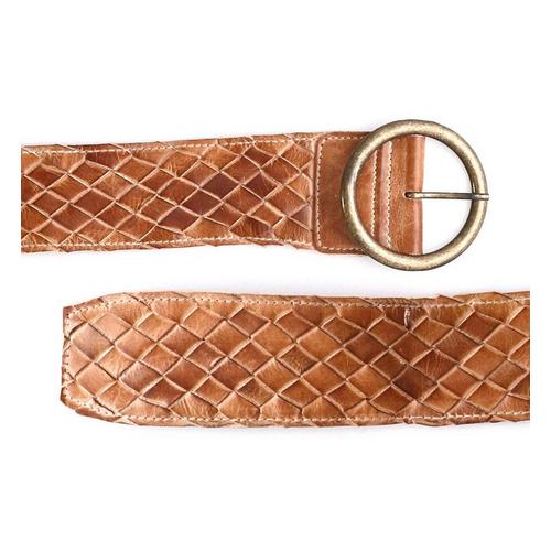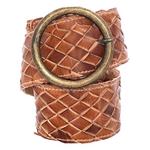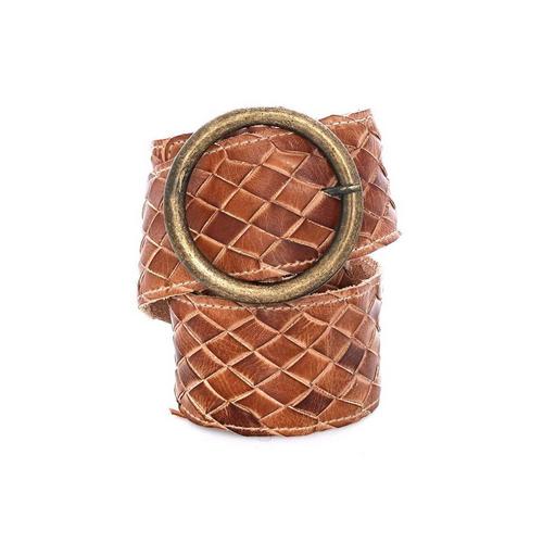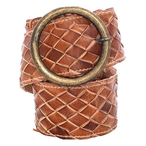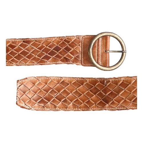 Stain finish for variance in tones of woven leather Raw edge for weathered appearance Hammered single prong, O ring buckle 2.2 in. wide (56mm) Made in Leon, Mexico