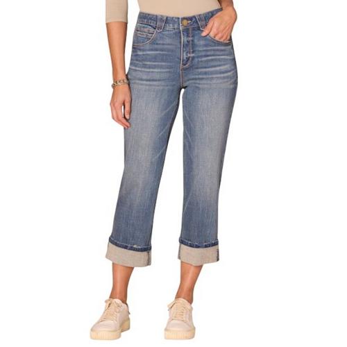 The “Ab”solution High Rise Round Up Boyfriend Crop with Cuff delivers casual charm with sculpting comfort. Designed with a relaxed boyfriend fit and cropped length, this style features a rolled cuff for a laid-back finish. The high rise flatters and elongates, while “Ab”solution® technology—featuring a hidden no-gap waistband and interior mesh panels—smooths, shapes, and supports. Effortlessly cool and easy to wear, it’s the perfect pair for everyday style with a touch of polish.
