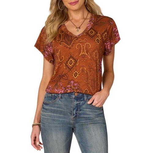 Old Price:Women's Democracy Embroidered Abstract Print Knit Boyfriend V-Neck Blouse