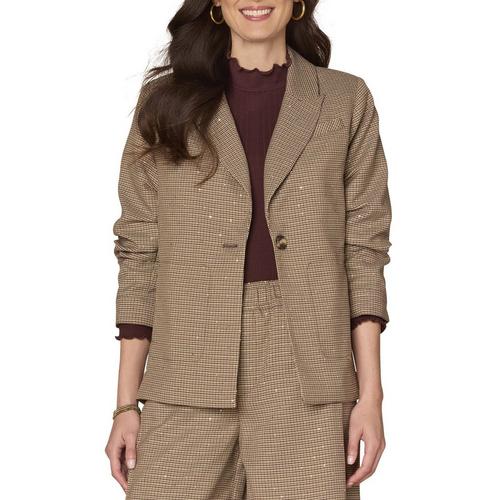 This single button blazer is all you need to upgrade your look for the office. It has three quarter ruched sleeves, princess seaming pockets, and scattered rhinestones with a herringbone pattern.