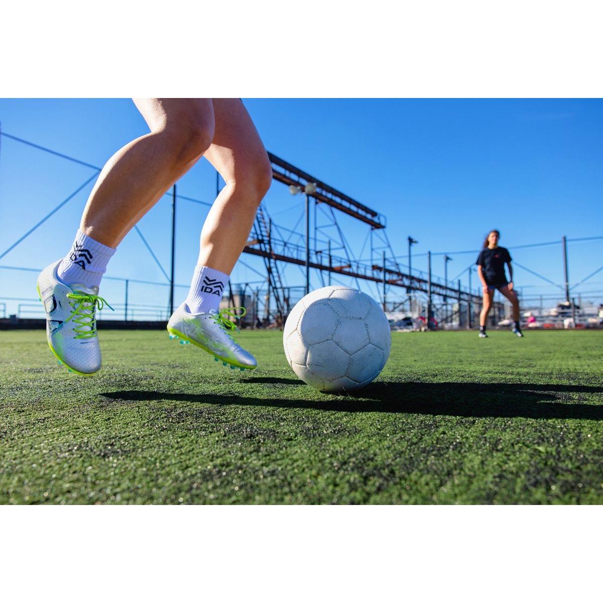 The Women's IDA Rise Club FG Molded Soccer Cleats are engineered for adaptability and comfort, helping you perform your best on the field. Designed with a traditional lace-up tongue, these cleats provide an adjustable and secure fit. The high-quality vegan leather upper offers a thinner feel and toe box, enhancing your ball control and responsiveness. Ideal for female athletes seeking an adjustable cleat with advanced features, the IDA Rise Club delivers a familiar feel with cutting-edge technology for superior performance on both firm ground and 3G artificial grass surfaces. Step onto the pitch with confidence in the Women's IDA Rise Club FG Molded Soccer Cleats.