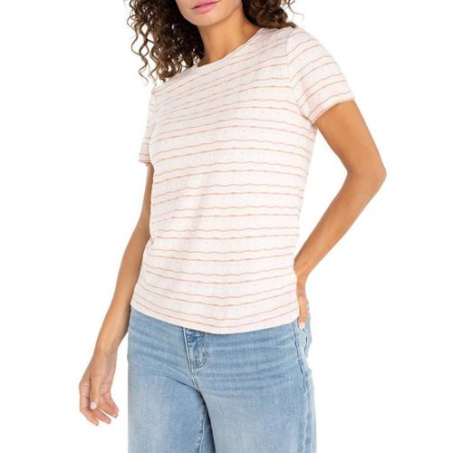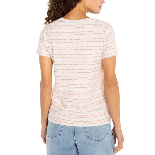 Casual, comfortable, and playful — this short sleeve crew neck knit tee features ribbed trim and a fun pink wavy stripe pattern. Soft and easy to wear, it pairs perfectly with jeans, skirts, or shorts for everyday style.