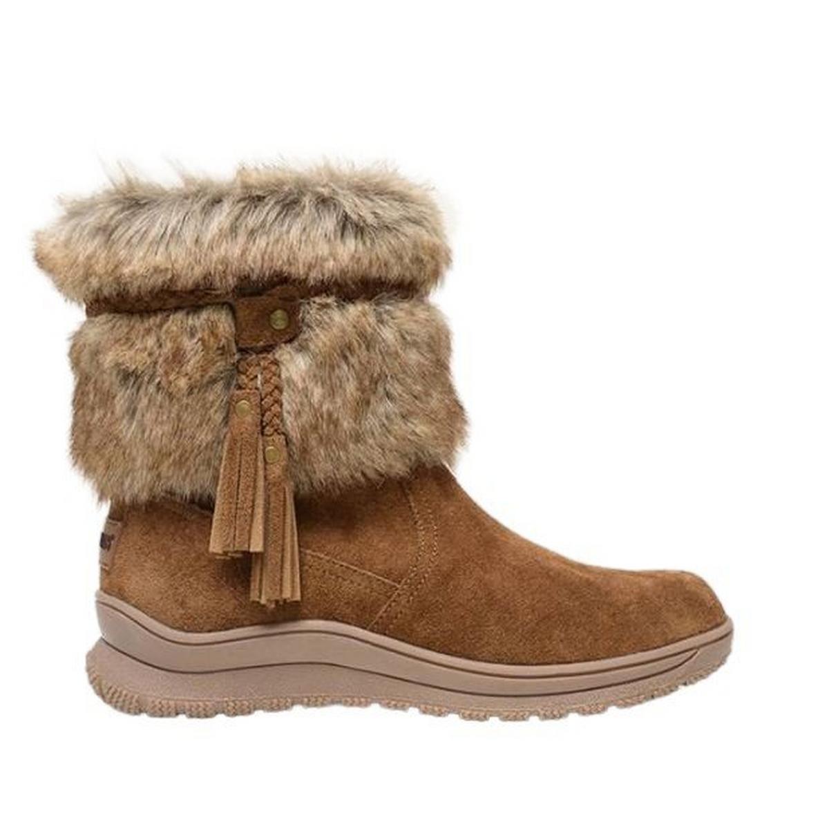 Shake up your style with a boot for snowy treks. Featuring layers of cascading faux fur accented by a braided self-suede tie, you'll demand attention at every turn. This water repellent winter boot is ideal through the wintery months for a playful edge that goes with any outfit.