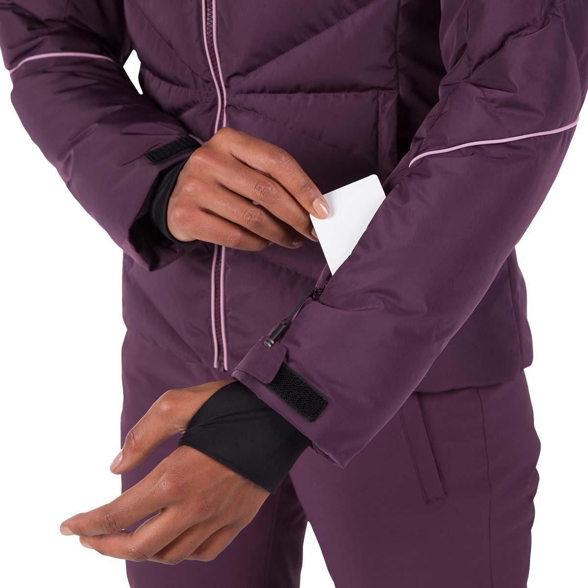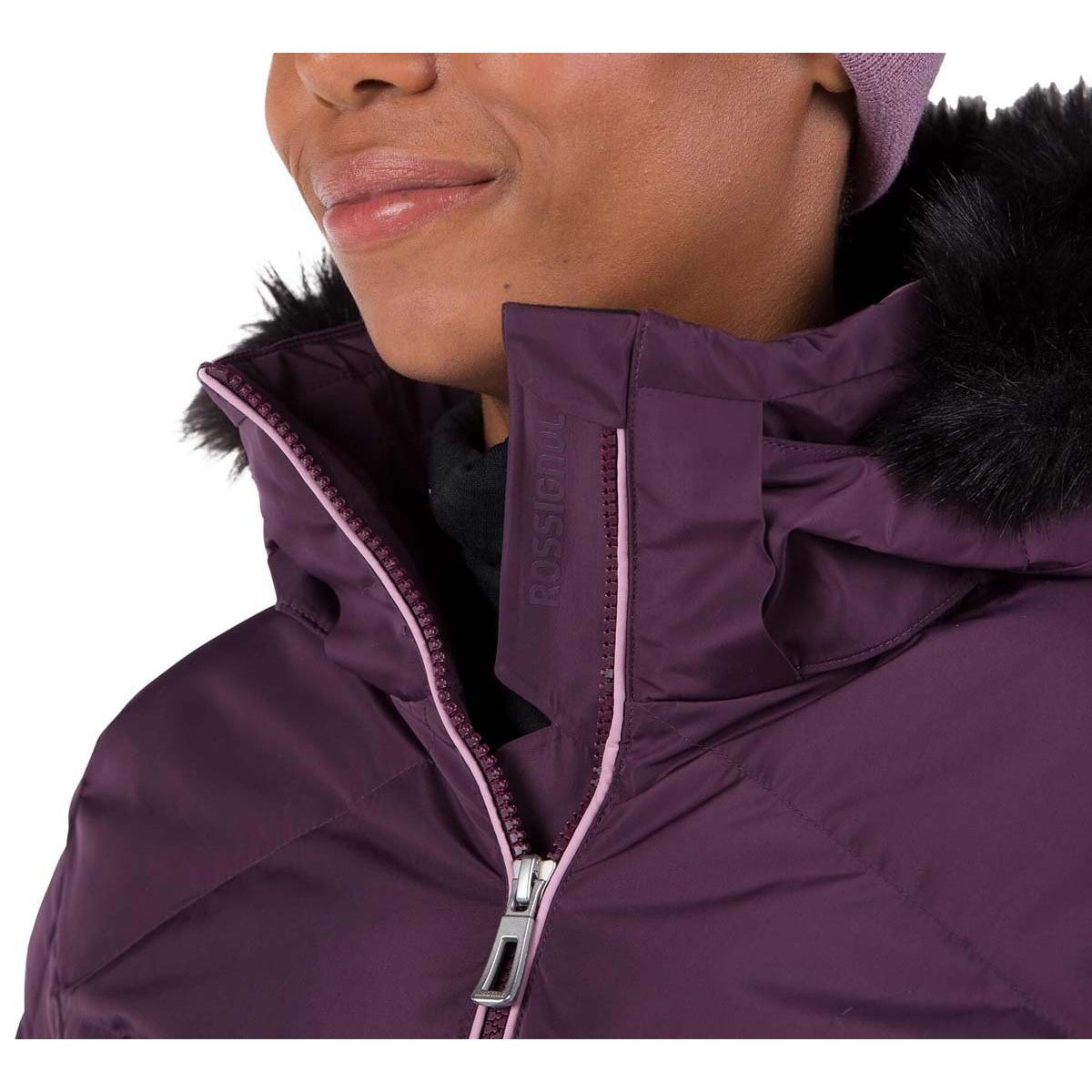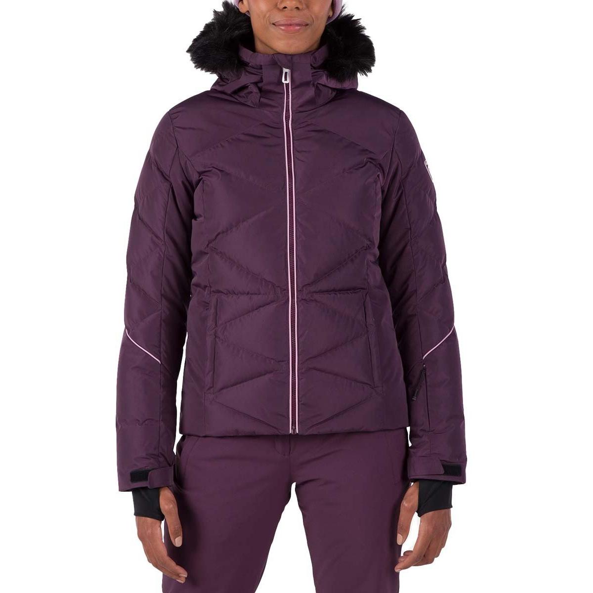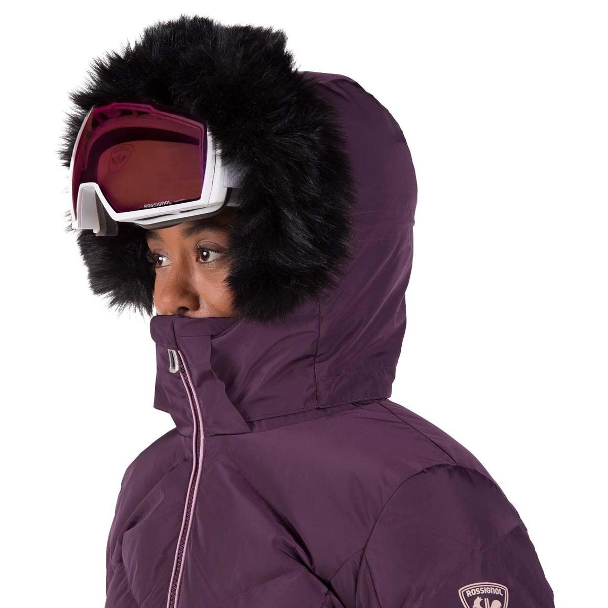 Zip up warmth you can feel. The women's Staci Pearly Ski Jacket offers all-conditions warmth with down-like synthetic insulation that seals in heat. A waterproof, breathable membrane sheds cold, stormy weather to keep you dry. A built-in powder skirt and integrated stretch cuffs with thumb loops further enhance weather protection. The removable hood includes detachable faux-fur trim for easy personalization. Design details include a feminine fit and a pearly finish that adds ski chic flair. A signature rooster logo patch reflects Rossignol's alpine legacy.