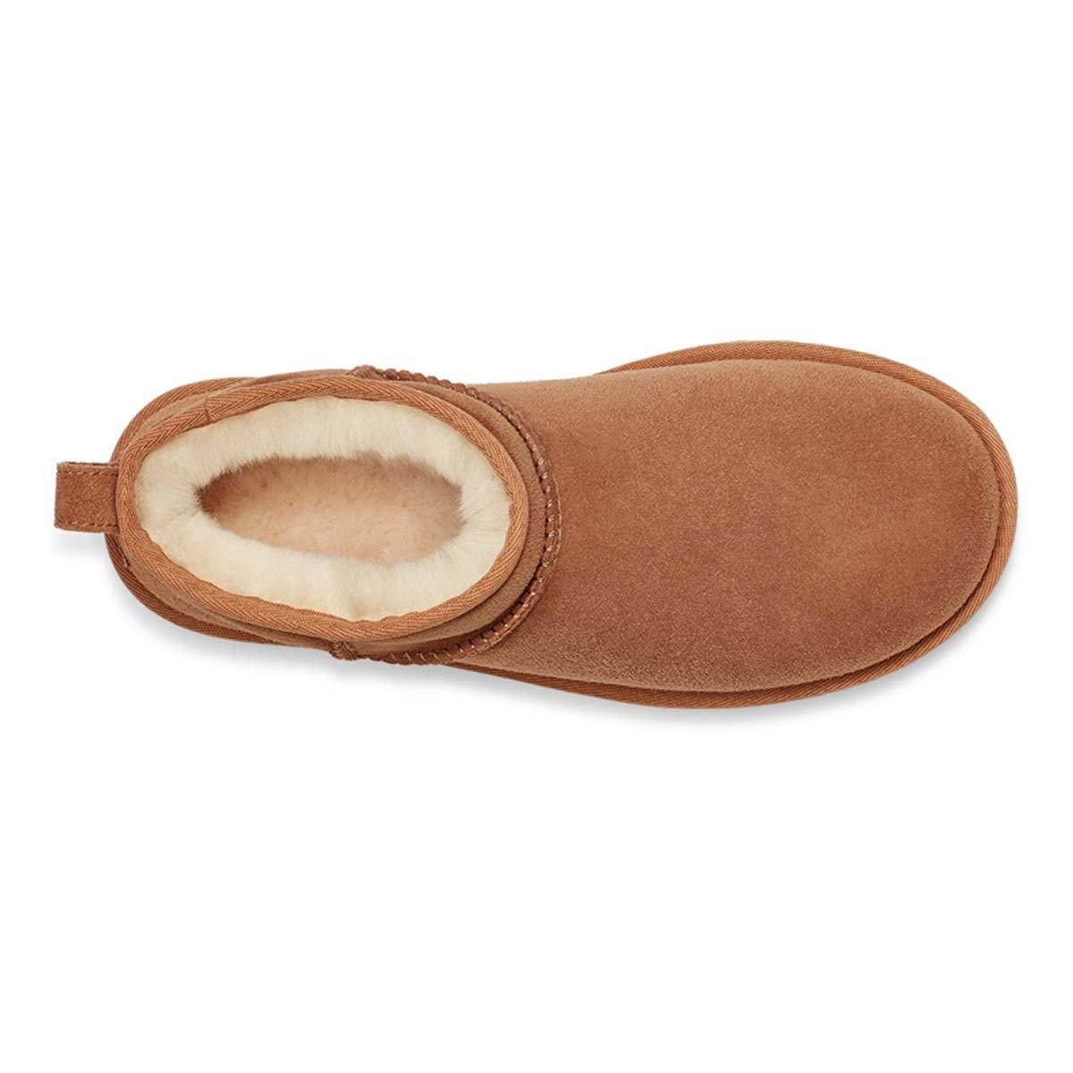 Elevate your casual style with the Women's UGG Classic Ultra Mini Shearling Boots. These boots feature a durable Twinface sheepskin upper, providing plush comfort that's perfect for everyday wear. An asymmetrical topline and suede heel counter add a modern twist, while the Treadlite or SugarSole EVA outsole ensures optimum walking comfort. These boots also include a topically applied water-repellent treatment to keep your feet dry and comfortable in any weather. With a leather heel label proudly displaying the UGG logo and a cozy, upcycled wool and lyocell sockliner, these boots are equally mindful of style, comfort, and sustainability. Discover the unmatched comfort and chic style of the UGG Classic Ultra Mini Shearling Boots!